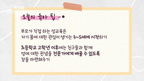 또 이런 성교육을 할 때쯤이면, 동성 부모는 괜찮은데 이성 부모가 아이를 씻길 때는 속옷은 반드시 입고 하시길 권합니다. 부모와 자녀 간에도 경계가 있다는 것을 자연스럽게 배워야 하거든요. 딸을 씻기는 아빠인데, 아빠가 속옷을 다 입고 씻길 때와 다 벗고 하는 거와는 아이 입장에서는 차이가 많은 거거든요.