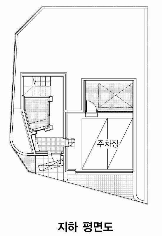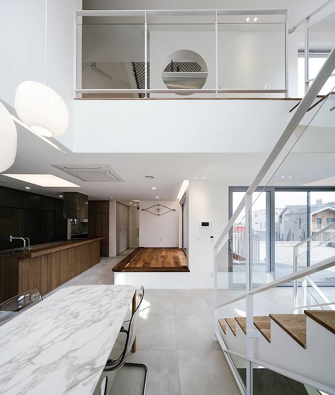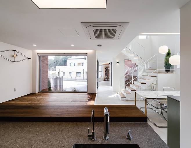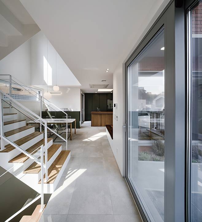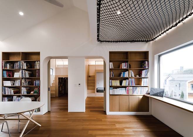주택은 실내에 주차장을 둔 지하 1층, 다락이 있는 지상 2층 규모로 지었다. 가장 눈에 띄는 것은 주택 출입구를 지하 1층에 배치한 점이다. 현관을 열면 커다란 테이블이 놓인 방이 보이는데 재택근무 중인 남편의 집무실이나 초등학생인 딸이 줌zoom 수업을 듣는 교실이자 책을 읽는 놀이공간으로 쓰고 있다. 주차장과도 연결돼 있다. 계단실을 통해 1층에 오르면 가족들의 공용 공간을 만날 수 있다. 계단실 왼쪽에 주방 및 식당, 욕실과 드레스 룸이 보이고 오른쪽 복도 끝에는 작은 거실이 있다. 다른 집과 달리 거실의 크기가 작은 이유를 물으니 손님이 자주 오지 않아 가족들을 위한 공간에 더 비중을 두었다고 말한다. 거실은 복도로 주방 쪽과 공간이 나누어져 있지만 별도의 응접실로 사용하기 위해 문까지 달아두었다. 마당을 향해 코너를 이루는 창가에는 언제든 걸터앉을 수 있는 윈도우 시트를 설치했다.