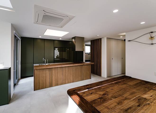 1층 주방과 식당이 있는 공용 공간에서 가장 눈길을 모으는 것은 아일랜드 앞 평상이다. 설계 초안에는 지금의 1층 평상 대신 2층 테라스가 있었다. 하지만 면적에 포함되는 2층 테라스는 생활에 필요하지 않아 삭제하고 1층 마당 일부를 끌어들여 지금의 평상 자리로 만들었다. 계획에 없던 평상이지만 엄마아빠가 주방에서 일하고 있으면, 아이들이 누워서 뒹굴 거리며 책 읽고 낮잠 자는 놀이터이자 휴식 공간이 됐다.