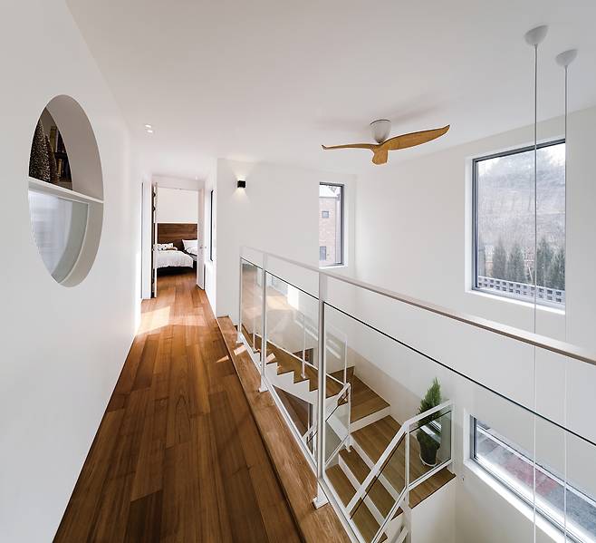 한층 더 오르면 가족들의 사적 공간인 방들로 이루어진 2층이 나온다. 계단실 왼쪽에는 가족실과 두 아이의 방이 있고 오른쪽에는 목재 침대 헤드가 시선을 끄는 부부 방이 있다. 딸과 아들 방은 모두 공부하고 잠자는 곳을 나눌 수 있도록 복층 형태로 만들었다.
