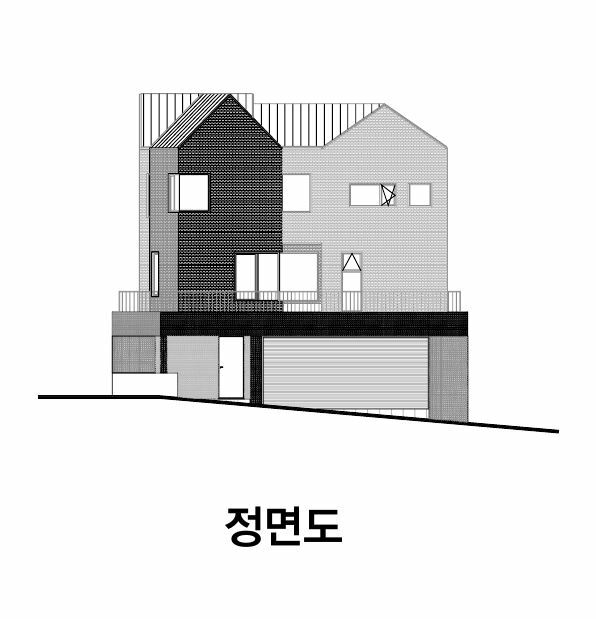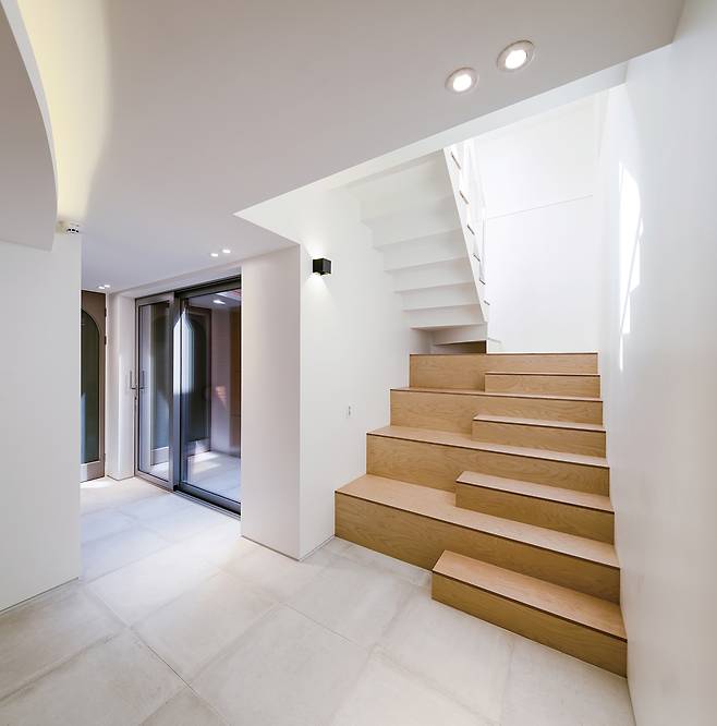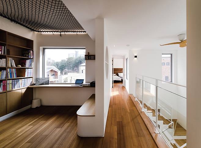 주택은 실내에 주차장을 둔 지하 1층, 다락이 있는 지상 2층 규모로 지었다. 가장 눈에 띄는 것은 주택 출입구를 지하 1층에 배치한 점이다. 현관을 열면 커다란 테이블이 놓인 방이 보이는데 재택근무 중인 남편의 집무실이나 초등학생인 딸이 줌zoom 수업을 듣는 교실이자 책을 읽는 놀이공간으로 쓰고 있다. 주차장과도 연결돼 있다. 계단실을 통해 1층에 오르면 가족들의 공용 공간을 만날 수 있다. 계단실 왼쪽에 주방 및 식당, 욕실과 드레스 룸이 보이고 오른쪽 복도 끝에는 작은 거실이 있다. 다른 집과 달리 거실의 크기가 작은 이유를 물으니 손님이 자주 오지 않아 가족들을 위한 공간에 더 비중을 두었다고 말한다. 거실은 복도로 주방 쪽과 공간이 나누어져 있지만 별도의 응접실로 사용하기 위해 문까지 달아두었다. 마당을 향해 코너를 이루는 창가에는 언제든 걸터앉을 수 있는 윈도우 시트를 설치했다.