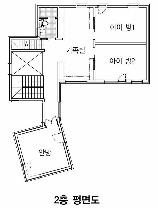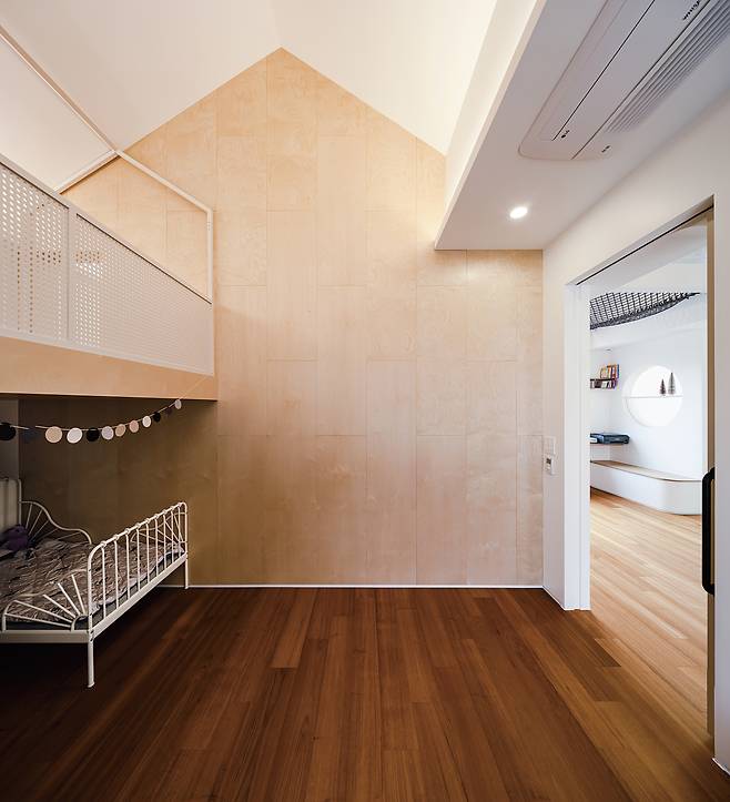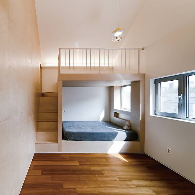 한층 더 오르면 가족들의 사적 공간인 방들로 이루어진 2층이 나온다. 계단실 왼쪽에는 가족실과 두 아이의 방이 있고 오른쪽에는 목재 침대 헤드가 시선을 끄는 부부 방이 있다. 딸과 아들 방은 모두 공부하고 잠자는 곳을 나눌 수 있도록 복층 형태로 만들었다.