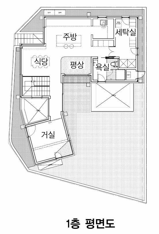 1층 주방과 식당이 있는 공용 공간에서 가장 눈길을 모으는 것은 아일랜드 앞 평상이다. 설계 초안에는 지금의 1층 평상 대신 2층 테라스가 있었다. 하지만 면적에 포함되는 2층 테라스는 생활에 필요하지 않아 삭제하고 1층 마당 일부를 끌어들여 지금의 평상 자리로 만들었다. 계획에 없던 평상이지만 엄마아빠가 주방에서 일하고 있으면, 아이들이 누워서 뒹굴 거리며 책 읽고 낮잠 자는 놀이터이자 휴식 공간이 됐다.