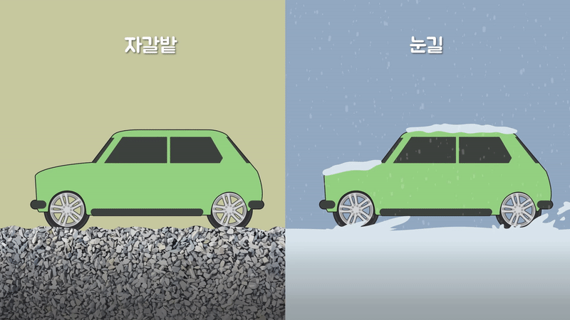 그런데 지면이 발휘할 수 있는 반력에는 한계가 있습니다. 아스팔트에서는 마찰계수(μ, 지면과 바퀴 간의 마찰력이 얼마인지에 관한 계수값)가 비교적 높아 무거운 차량의 구동력에 대항하는 반력을 줄 수 있으나 자갈길이나 흙길, 눈길 등 비교적 마찰계수가 낮은 노면은 높은 구동력을 감당할 수 없고, 이에 대한 반력을 낼 수 없어 엔진 출력을 온전히 활용할 수 없어서 문제입니다.