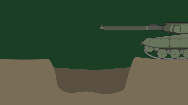 또한, 도랑처럼 큰 웅덩이가 있을 때도 궤도가 항상 받쳐주고 있어서 차륜 차량에 비해 비교적 쉽게 통과할 수 있습니다. 그리고 앞서 수직 장애물을 통과할 때 무한궤도 차량은 바퀴의 높이와 크게 상관이 없다고 했는데, 전투 시 적에게 발견될 가능성을 낮출 수 있는 장점이 됩니다.
