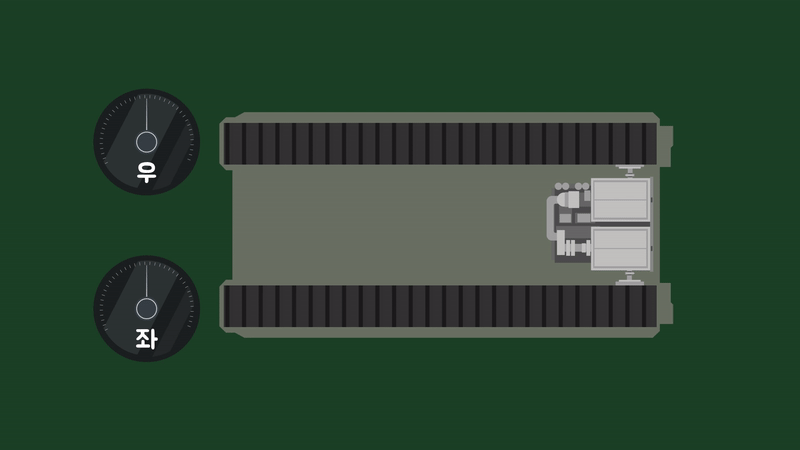 예를 들어서 전차 운행을 시연 시 제자리 선회(pivot turn)하는 장면이 있습니다. 이때 좌측 궤도는 후진 방향, 우측 궤도는 전진 방향으로 해서 같은 속도로 구동하면 선회반경은 0이 되므로 360도로 회전할 수 있습니다.