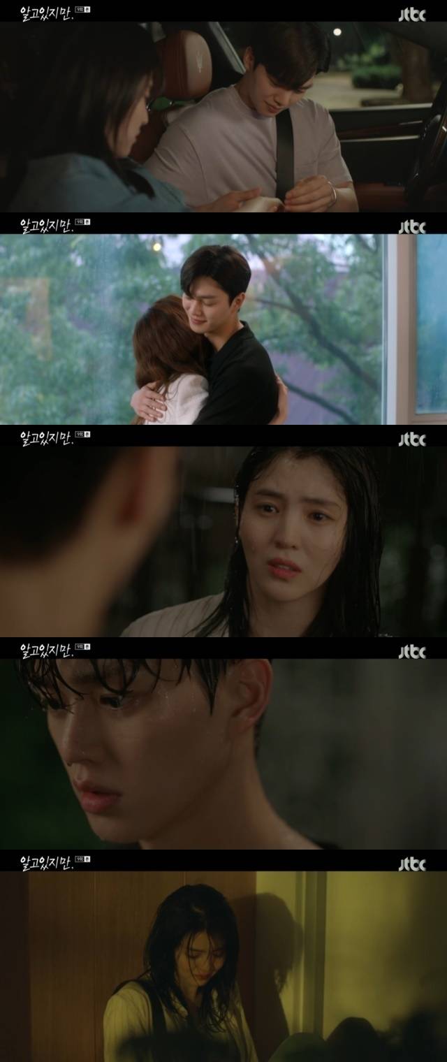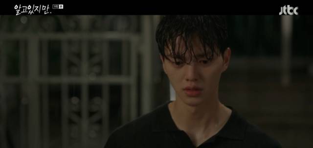 여기에 박재언은 "양도혁은 실망시키고 싶지않다고 했냐. 근데 너 나랑 그런사이였던 거 맞잖나"라는 막말을 더했다. 결국 유나비는 박재언에게 똑같이 말로 상처주며 "다시는 내 눈 앞에 나타나지 마라"는 말을 남기고 자리를 떴다. 박재언은 빗속에 홀로 남아 '나비를 완전히 잃었다'며 상실을 실감했다. (사진=JTBC '알고있지만,' 캡처)