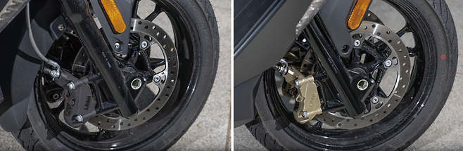 C 400 시리즈는 ABS뿐 아니라 트랙션 컨트롤(ASC)까지 기본 장착되어서 안전한 라이딩을 지원한다. 전자제어 스로틀과 함께 주목할 변화는 새로운 브레이크 시스템이다. 이전 모델은 브램보의 하위 브랜드인 바이브래 래디얼 캘리퍼를 썼다. 반면 신형은 최근 브렘보가 인수한 스페인 브레이크 브랜드 호따후안(J.JUAN) 제품이다. 구형의 경우 브레이크 레버 작동 구간 중 처음 20~30%는 거의 제동력이 없다가 뒤쪽에서 점진적으로 패드 압력이 높아진다. 그래서 급제동 때 응답성이 살짝 느리고, 제동 시간에서 손해를 본 만큼 밀리는 느낌이 든다. 반면 신형은 브레이크 레버를 잡자마자 캘리퍼가 압력을 가하기 시작해서 레버움직임 절반 이하에서 이미 제동력 80%가 나온다. 따라서 급제동 때 훨씬 빠르게 반응하고, 이후 마지막 부분에선 레버 감각이 단단해지며 더 잡히지 않는다. 양쪽 모두 타이어의 한계는 정해져 있기에 어느 쪽이 월등하게 좋은 제동력이라고 할 수 없다. 하지만 개선된 브레이크 세팅이 급제동에 유리했다. 대신 순간적으로 프런트 포크가 끝까지 눌리며 타이어가 하중을 모두 감당하지 않도록 브레이크 레버를 최대한 섬세하게 잡는 게 포인트다.