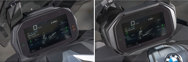C 400 X의 디자인은 역동적이다. 차체를 감싼 카울 면적을 최소로 하면서 에지를 살려 민첩한 느낌을 준다. GS 특유의 비대칭 헤드라이트에는 Y자 형태 주간주행등을 넣어서 낮에도 선명한 인상을 만든다. 크기가 작은 작은 윈드 실드를 가졌음에도 곧추선 각도 덕분에 헬멧 쪽으로 들이치는 바람을 효과적으로 분산한다. 그 뒤로 6.5인치컬러 디스플레이가 시선을 끈다. 미들급 스쿠터에서 보기 드문 사이즈. 실제로 큰 화면을 통해 운행에 필요한 각종 정보를 볼 수 있다는 것이 장점이다. 최신 소프트웨어 버전에선 한글 인터페이스도 구현하고, BMW 공식 헤드셋을 통해 모터사이클과 스마트폰을 연결할 수도 있다. 내비게이션 같은 고급 기능은 한국에서 지원하지 않아서 아쉽다. C 400 X에서 가장 돈 값한다고 느끼는 부분이 컬러 디스플레인 만큼 지속적으로 업그레이드가 이뤄지면 좋겠다.