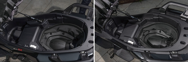 날렵하고 콤팩트한 차체 구조를 얹은 만큼 희생한 것은 시트 아래 수납공간이다. 앞은 작은 오픈페이스 헬멧, 뒤쪽은 플렉스 케이스 방식으로 스위치를 눌러 아래로 확장해야 제트헬멧, 혹은 작은 사이즈의 풀페이스 헬멧이 겨우 들어간다. 외부 통신장치나 선바이저가 달린 풀페이스 헬멧은 넣을 수 없다. 플렉스케이스는 좁은 공간을 활용하는 아이디어와 활용성 측면에서 뛰어나다. 하지만 뒤 서스펜션 스트로크 공간을 임의로 활용하는 것이어서 정차 시에만 수납공간을 확보할 수 있다는 게 꽤 불편하다. 실제로 C 400 X를 타면서 가장 불편했던 것이 수납공간 부족이다. 손바닥 크기의 작은 상자도 높이나 폭 1~2cm 생김새 차이로 시트 아래 넣지 못하는 경우가 허다했다.