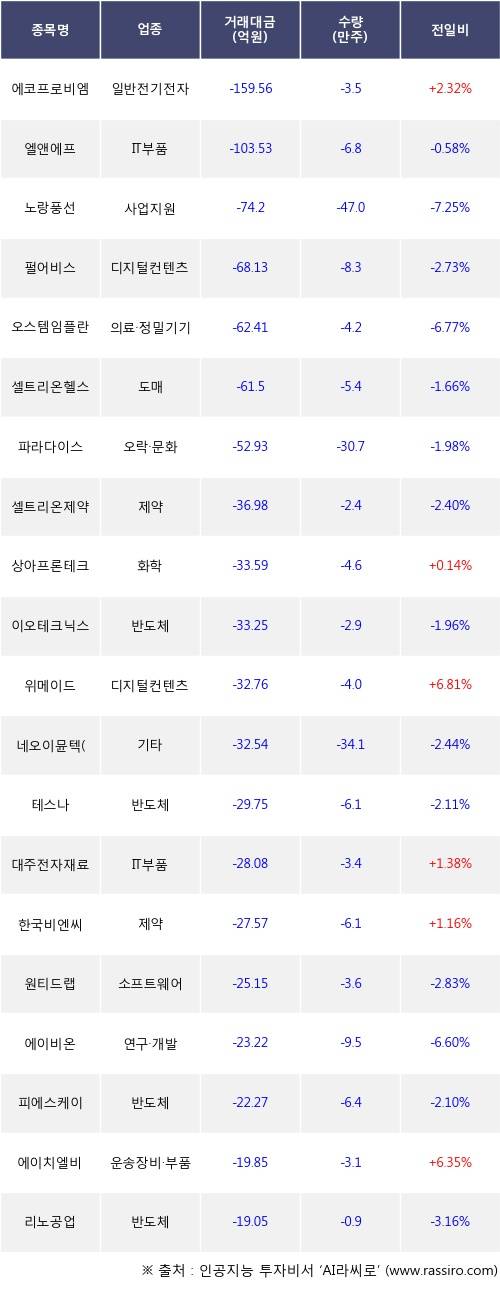 기관 투자자의 순매도 상위 20개 종목은 에코프로비엠, 엘앤에프, 노랑풍선, 펄어비스, 오스템임플란트, 셀트리온헬스케어, 파라다이스, 셀트리온제약, 상아프론테크, 이오테크닉스등이다.
