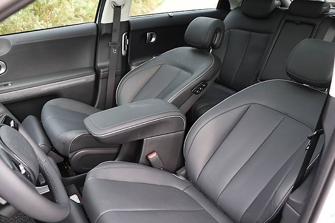 시트는 5인승. 모든 시트는 전동 조절식이다. 종아리 받침대도 있고 시트백의 리클라이닝 각도 크다. 앞뒤로 140mm 이동이 가능하다는 것이 큰 장점이다. 앞 시트의 헤드레스트가 리어 시트에 닿을 정도로 눞일 수 있다는 것도 장점이다. 무엇보다 눈길을 끄는 것은 EV6도 그렇지만 친환경 소재를 사용했다는 것이다. 아우디처럼 패트병을 재활용한 시트와는 다른 사탕수수와 옥수수 등에서 추출한 바이오 성문의 원사가 포함된 원단으로 만들어졌다. 그렇지 않아도 넓은 공간에 시트백의 두께도 통상적인 것보다 얇게 처리했다.