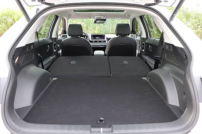 하지만 내용상으로 더 시선을 끄는 것은 준중형 SUV 스포티지 정도의 차체에 휠 베이스가 3미터나 된다는 점이다. 그랜저(2,885mm)나 팰리세이드(2,900mm)보다 더 크다. 보닛 부분에 엔진이 없다는 것을 최대한 활용한 패키징이다. 이 크기는 실내 공간에 고스란히 반영된다.