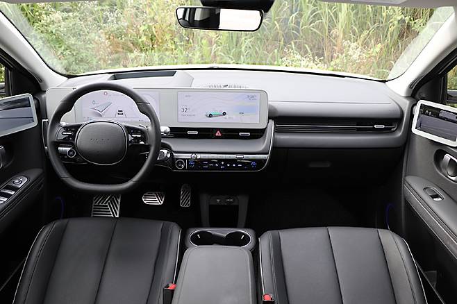인테리어는 좀 더 분명하게 전기차 시대를 표현하고 있다. 더 정확히는 디지털 감각이 강조되어 있다. 익스테리어와 마찬가지로 전체적으로는 직선이 주도하고 있다. 두 개의 12.3인치 디스플레이창이 연결되어 있지만, 곡면형은 아니다. 현대 모비스제 HMI 시스템은 나올 때마다 새로운 그래픽과 내용이 추가되며 놀라게 한다. 애플 카플레이와 안드로이드 오토에 대응한다. 이미 오래전부터 발전해 온 블루링크 시스템도 전기차에서 더 빛을 발하고 있다.