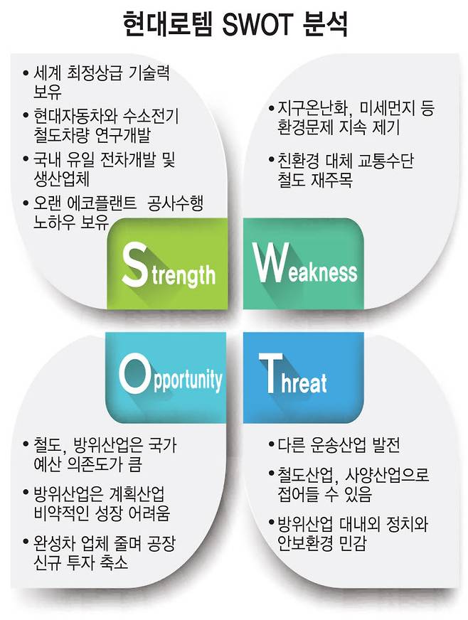 현대로템은 레일솔루션 부문이 내수시장에서 독점적 지위에 있다. 에코플랜트와 디펜스솔루션 부문 역시 각각 계열 기반 수요와 방위산업에 기초한 대정부 수요 등 비교적 안정된 사업여건을 보유하고 있다. 다만 이들 대부분이 거액의 프로젝트성 수주산업이기에 신규 수주활동이 꾸준히 뒷받침되지 않을 경우 실적변동 부담이 있다.