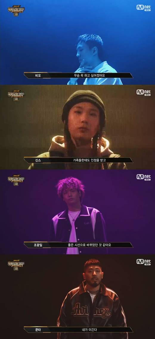 한편 쿤타는 "여기까지 힘들게 왔다. 내가 인기다. 무조건 이긴다"고 각오를 다졌다 신스는 "'쇼미더머니'에 나와서 가족들한테 인정받고 우승까지 거머쥐겠다"며 바람을 드러냈고 조광일 역시 "저를 바라보는 시선들이 좋은 시선으로 바뀐 것 같다. 제가 우승해야 한다"라고 다짐했다.
