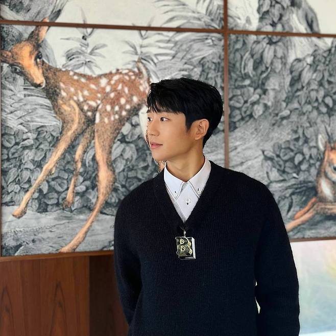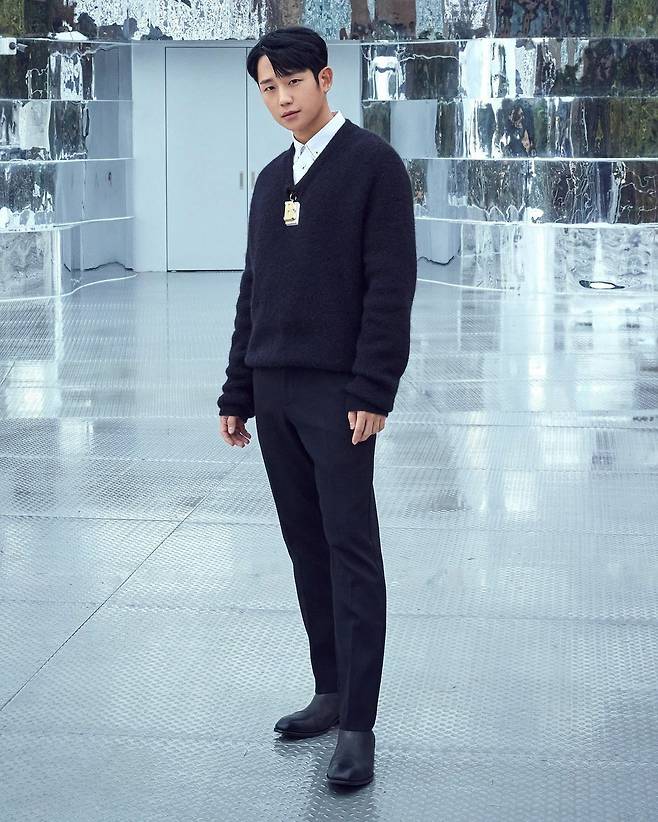 정해인은 깔끔한 니트와 와이셔츠를 레이어드해서 스타일링 했어요💕