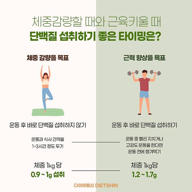 단백질 섭취시기는 언제 해도 괜찮지만, 체중감량, 근육생성에 목적에 따라서는 단백질 섭취 시간이나 운동과 식사 간격, 단백질 음식 종류 등에도 차이를 둬야 해요.