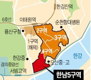 한남5구역은 한남 뉴타운 내에서도 한강 조망 면적이 가장 넓은 곳으로 반포대교 북단 남산 자락에 자리한다. 건축물은 해발 90m 내에서 남산의 7부 능선을 넘지 않도록 지상 최고 23층 이하로 지을 수 있다. 용적률 219.4%를 적용해 2555가구(임대주택 포함)로 조성할 예정이다. 이 중 임대주택 384가구는 구역 전체에 분산 배치한다. 전용면적 60㎡ 이하 소형 위주에서 탈피해 전용 84㎡도 20가구 넣을 방침이다. 또 분양 및 임대주택을 추첨해 섞어서 조성할 계획이다.