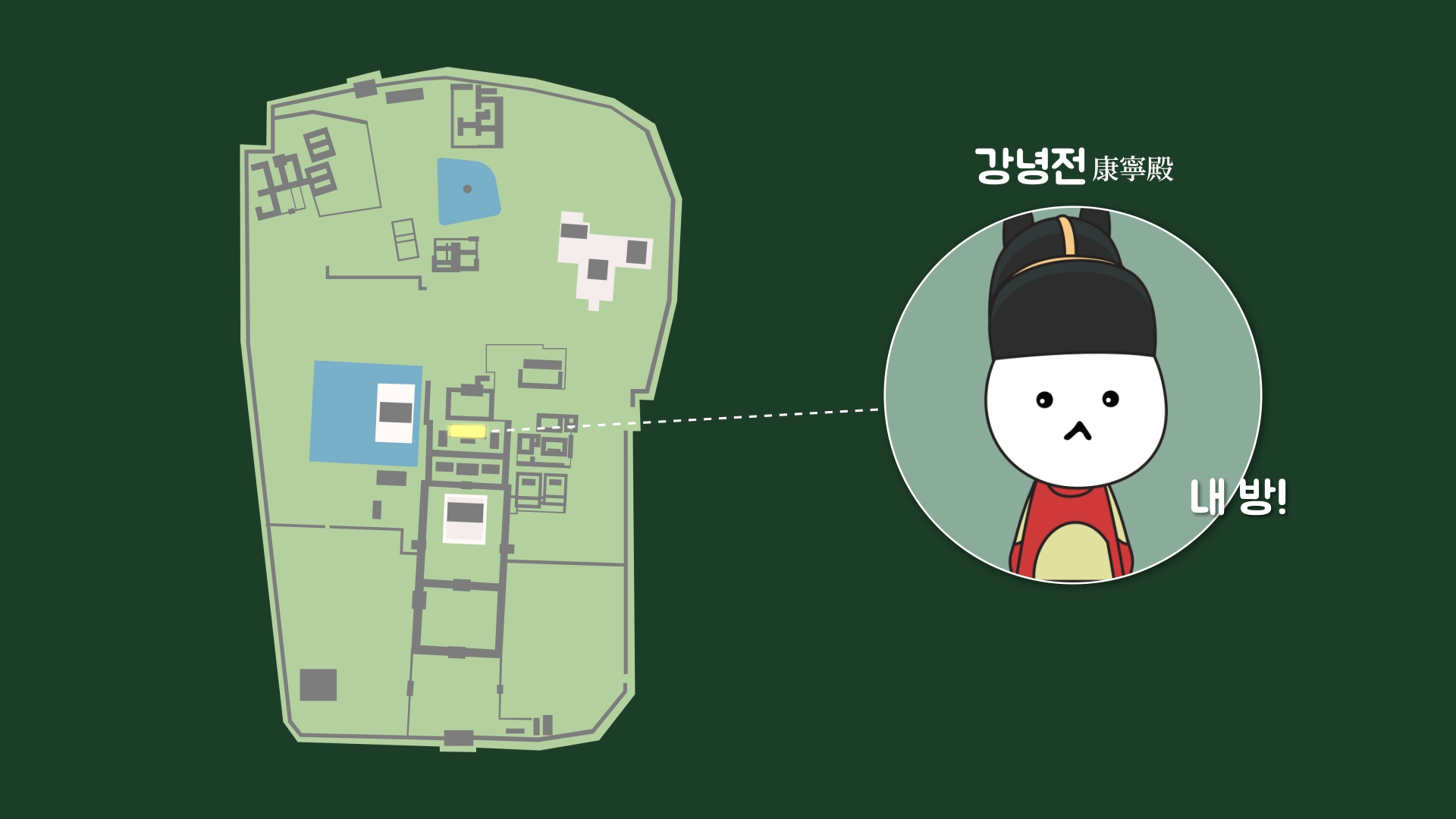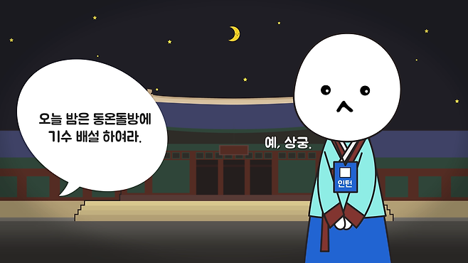 어쨌든 합궁일 당일 큰방상궁이 침전을 담당하는 견습 나인인 생각시에게 동온돌방에 이부자리를 깔아놓으라고 지시합니다. 보통 왕비는 서온돌방에 머무르는데, 합궁일에는 왕과 왕비가 동온돌방에서 만나게 됩니다. 이는 강녕전에서 후궁이나 궁녀와 합궁할 때도 마찬가지입니다.