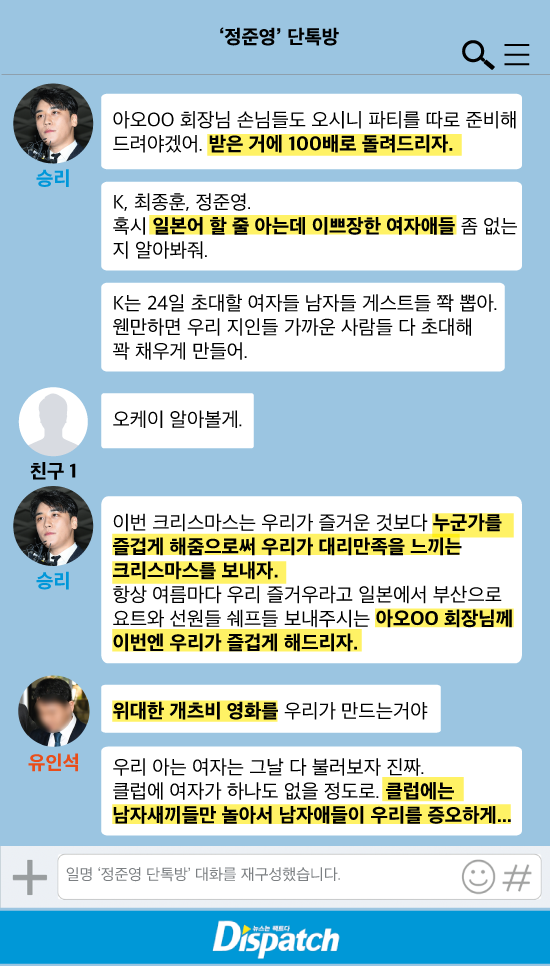 승리는 마치 ‘접대’ 사령관처럼 (보이지 않는) 현장을 진두지휘했다. ‘잘 주는’ 여자를 부르라 지시했고, “똑바로 해라”, “실수하지 마라”며 다그쳤다.