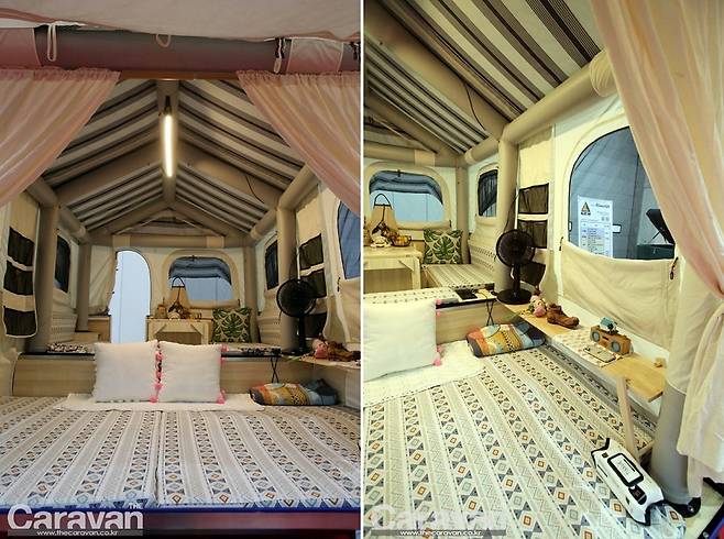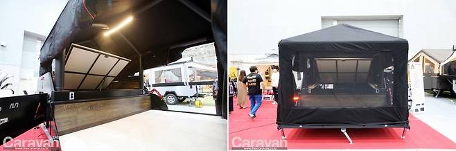 텐트 트레일러는 소형 카라반의 위, 아래 절반 사이즈에 불과하지만 세팅 후의 공간은 평상 모드로 상당히 넓고 따듯하며 편안해진다. 추가 확장 텐트, 타프가 결합되면 이동 시의 모습에서 4~6배 이상의 공간으로 뛰어난 확장성을 자랑하고 있다.