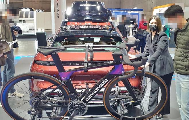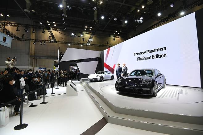 - 포르쉐 부스를 찾은 관람객이 큐레이터에게 차량 설명을 듣고 있는 모습