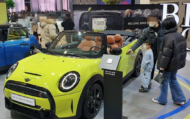 - 전시장을 찾은 가족이 미니(MINI)를 직접 차를 타보고 있는 모습