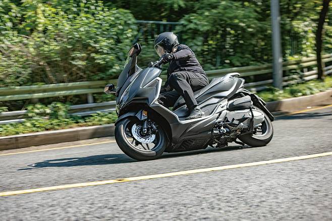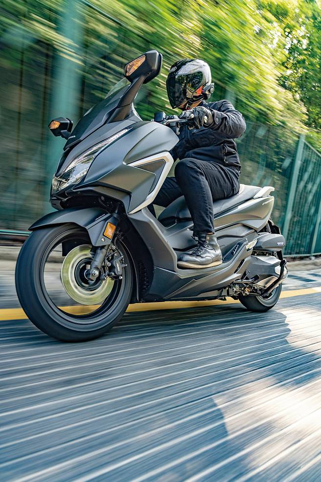 배기량은 330cc로 실제 배기량이 이름보다는 조금 부족해 크게 바뀌지 않은 것처럼 느껴지지만 기존 모델이 279cc였기 때문에 실제로는 이름처럼 50cc는 커진 셈이다. 엔진은 아이들링에서는 진동이 차체 전반에 퍼져나가며 자신의 존재감을 어필하는데 회전수가 올라가면 진동이 줄어들고 막상 바퀴가 굴러 갈 때는 엔진의 존재감은 거의 다 사라지고 가속은 매끄럽게 이어진다. 다른 브랜드에서는 느끼기 힘든, 이 역시 지극히 혼다다운 감각이다. 포르자300은 주행성능에서 경쟁 모델인 엑스맥스300에 조금 밀리는 느낌이었는데 포르자 350이 되면서 이제 스펙상으로도 소폭 앞서게 되었다. 하지만 워낙 미미한 차이다보니 실제 주행으로 테스트 해보니 우열을 가리기 힘들정도다. 예를 들어 가속 성능의 차이는 누가 미묘하게 빠르게 스로틀을 열었느냐가 더 큰 차이를 만들 정도다. 하지만 주행감각은 완전히 다르다. 특히 핸들링이 독특했다. 방향을 바꿀 때 마치 공중에 뜬 채로 달리는 것 같은 부유하는 감각으로 돌아간다. 접지감이 진하게 느껴지는 엑스맥스와 달리 마치 스케이트로 돌아가듯 매끄러운, 하지만 라인을 확실히 물고 있는 느낌이다. 이는 최근 혼다스쿠터들에게서는 공통적으로 느껴지는 느낌이기도 하다. 이 감각이 처음에는 불안하게도 느껴지지만 익숙해지면 코너를 별 노력 없이도 빠르게 돌아나가는 느낌이 든다. 실제로도 포르자가 코너에선 조금 더 빨랐다.