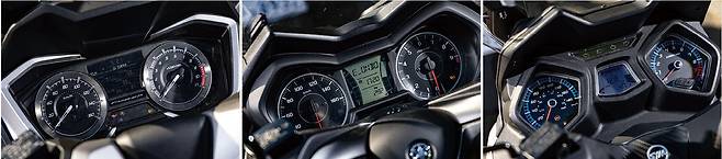 계기반은 소재나 시인성, 정보량 등을 종합했을 때 포르자의 완승이다. 엑스맥스 역시 자동차 계기반을 연상시키는 고급스러움이 돋보인다. 제트플러스는 스포티한 감각은 잘 살리고 있지만 디테일이 조금 아쉽다.