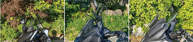 실드는 전동으로 높이를 조절할 수 있는 포르자가 압도적으로 좋았다. 특히 무단으로 조절되고 작동속도가 빨라 라이더의 키나 상황에 따라 최적의 높이를 쉽게 찾을 수 있었다. 제트플러스와 엑스맥스는 볼트를 풀어 높이를 조절하는 방식을 사용한다.