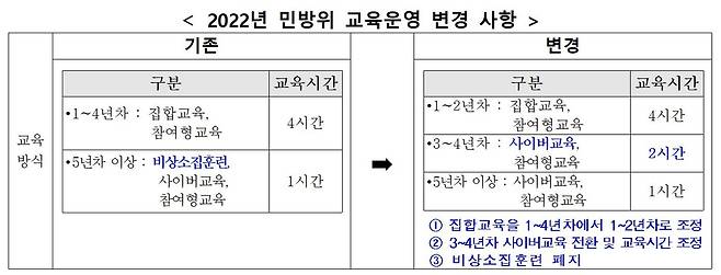 올해까지 민방위교육은 1~4년차에 대해서는 연간 4시간의 집합교육이, 5년차 이상 대원에 대해서는 연간 1시간의 비상소집훈련이 실시됐다.