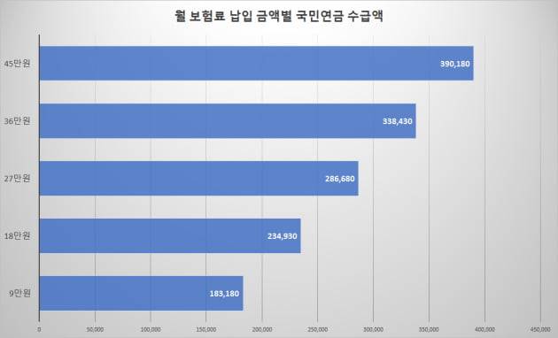 월소득 400만원에 해당하는 보험료인 36만원을 매달 낼 경우엔 월 33만8430원을 받는다. 내는 보험료보다 매달 받는 연금이 적다. 낸 기간보다 더 오랜 기간 받아야 원금이 회수되는 구조다.