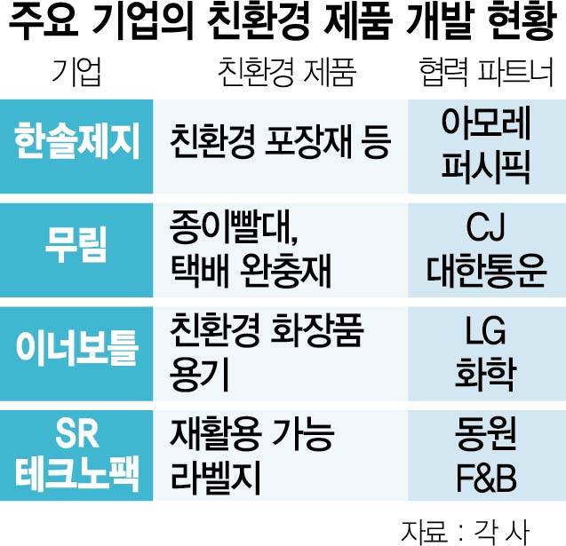 한솔제지(213500)와 무림P&P 등 제지 대기업에도 친환경 소재 개발 요청이 쇄도하고 있다. 무림페이퍼(009200)는 종이로 만든 친환경 택배 완충제를 CJ대한통운과 공동 개발했고 친환경 종이빨대 소재도 상용화 했다. 한솔제지 역시 친환경 포장재 생산을 시작하고 아모레퍼시픽, 이디야커피 등과 친환경 제품 생산을 늘리고 있다.
