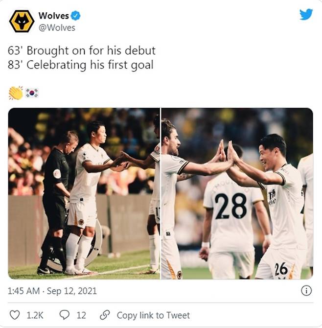 울버햄튼은 경기 뒤 트위터에 "63분 황희찬 데뷔, 83분 첫 골을 축하합니다"란 글을 올려 함께 기뻐했다.
