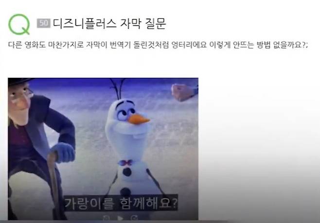 한 네티즌은 디즈니플러스의 콘텐츠인 '올라프의 겨울왕국 어드벤처'의 한 장면을 캡처해 올렸다. 캡처 장면은 울라프가 "함께 성에 가시지 않을래요?"(You're welcome to join us in the castle)라고 묻는 장면이지만 한글 자막 서비스에는 "가랑이를 함께해요?"라고 나온다.