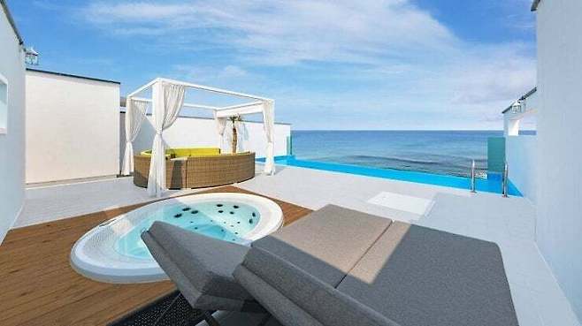 풀빌라 1층에는 공용 수영장과 카페도 운영하는데, 아름다운 포항 바다와 함께 여유로운 시간을 즐겨보자.