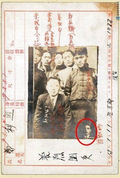 | ▲ 서울 서대문형무소 수형기록카드에 남아 있는 1920년 3월께로 추정되는 의열단 창립 초기 단원들의 모습. 사진 속 마지막 줄 오른쪽부터 김원봉, 곽재기, 강세우, 김기득, 이성우. 중간에 앉은 이가 정이소. 오른쪽 하단에 따로 붙은 사람이 김익상이다. 사진에서 붉은색 표시한 인물이 김익상이다. |