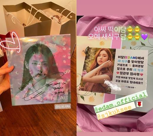 같은 날 신세경은 자신의 인스타그램 스토리에 여러 장의 사진을 게재했다. 공개된 사진에는 신세경의 EDAM엔터테인먼트 직원들이 '새 식구 맞이' 기념으로 돌린 떡, 신세경의 반려견이 그려진 살구색 케이크가 담겼다. 그러나 무엇보다 눈길을 끈 것은 아이유의 사인이 담긴 '라일락' 앨범. 해당 앨범에는 '신세경 선배님, 친하게 지내요'라는 글귀가 적혀 있다. 아이유 역시 자신의 인스타그램에 떡 사진을 올리며 "아싸 떡이다, 오예 새 식구다"라며 반가움을 표했다. 이에 팬들은 두 사람의 새로운 친분에 기대를 감추지 못하고 있다.