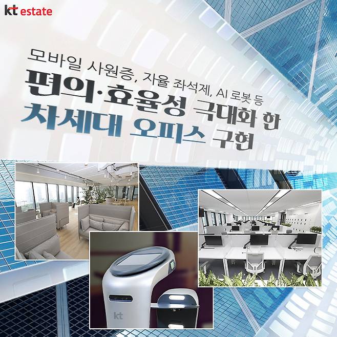 KT송파빌딩의 오피스동은 스마트 오피스 시설로 KT의 AI/DX 부분, 엔터프라이즈(Enterprise) 부문과 글로벌 바이오기업인 씨젠이 입주해있다고 하는데요. KT의 주요 부문이 입주한 만큼 AI, 로봇, 미디어, 블록체인 등 KT 스마트 오피스 및 디지털 플랫폼 서비스 기술이 총 집약돼 있다는 점이 특징입니다.