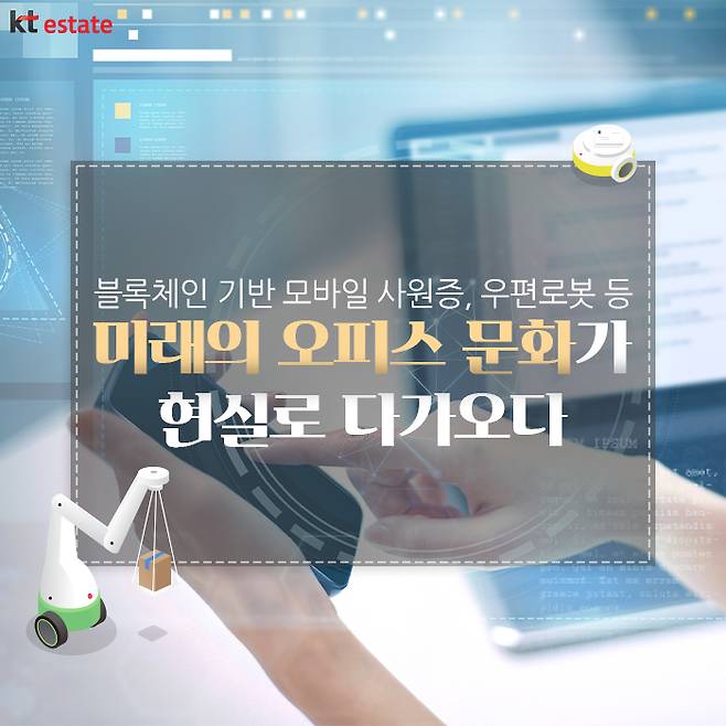 화창한 가을의 어느 날, A 과장은 오늘도 기분 좋게 출근길에 나섭니다. 사옥에 들어서니 AI 방역로봇이 실내를 오가며 공기 살균하는 모습이 보입니다. A 과장은 목에 걸던 사원증 대신 블록체인 기반 모바일 사원증으로 게이트를 통과한 뒤, 모바일 시스템으로 예약한 5층 워크스테이션 좌석으로 발걸음을 옮깁니다. 전자 명패에는 이미 A 과장의 소속 부서와 이름이 표기되어 있습니다. 그는 동료들과 함께 8층 로봇카페에서 바리스타 로봇에게 모닝커피를 주문합니다. 주문 후 자리에 돌아오니 서빙로봇이 커피를 가져다줍니다. 오후에는 우편로봇이 바쁜 A과장 대신 직접 테스트 기기를 배송해줘 일하기에 매우 편리합니다.