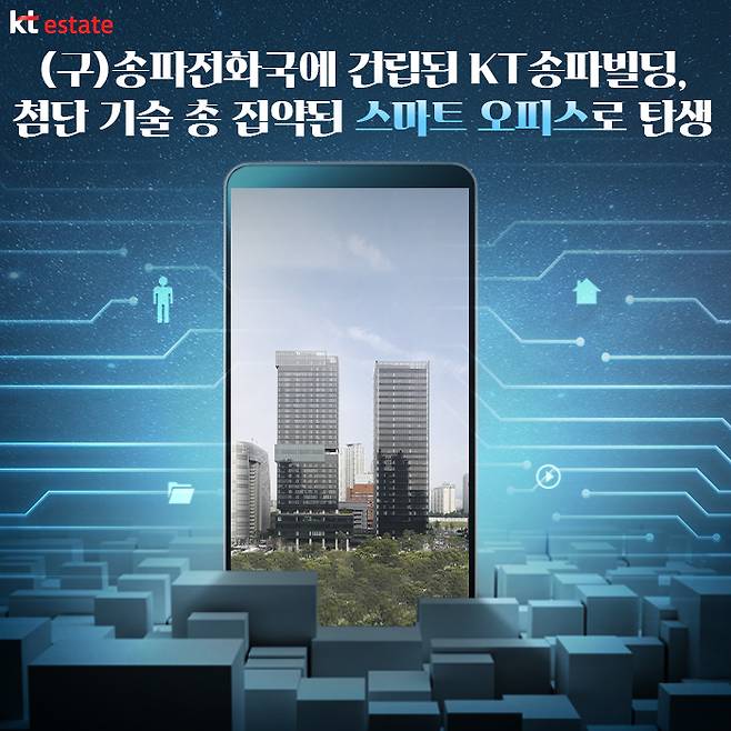 한편, 지난 9월 30일 개관한 KT송파빌딩은 스마트 오피스 문화를 선도하는 대표적인 사례로 손꼽힙니다. 앞서 첫 단락에서 소개한 이야기가 바로 KT송파빌딩의 실제 시스템들을 가상의 스토리로 엮은 것인데요. KT송파빌딩은 9월 30일 잠실역 인근 (구)송파전화국 자리에 생긴 미래형 AI 타워이자, 복합건물입니다. 두 개의 건물이 하나로 연결된 투 타워(Two Tower) 형태로 하나는 호텔동, 다른 하나는 오피스동으로 구성돼있습니다.