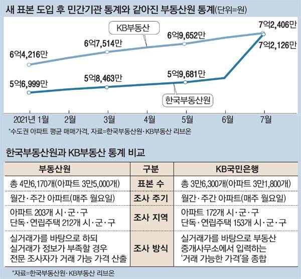 그 결과 차이가 심하던 부동산원 통계와 KB부동산 통계는 비슷해졌다. 올 1월만 해도 KB부동산의 수도권 평균 매매가격은 6억4216만원으로 부동산원 통계(5억6999만원)와 7000만원 이상 차이가 났지만, 7월에는 부동산원이 7억2126만원, KB부동산이 7억2406만원으로 격차가 280만원으로 줄었다. 서울 아파트 가격도 매달 KB부동산 통계가 부동산원 통계보다 1억~2억원가량 높았는데 7월엔 KB부동산이 11억5751만원, 부동산원이 11억930만원을 기록했다.