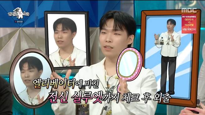 "거울이 없으면 외출이 힘들다"는 이찬혁은 "종류별로 거울이 있다. 화장실에서 피부를 보고, 화장대 거울로는 헤어를 체크하고 상반신을 완성한다. 옷장에서는 전신을 체크한다. 패션에서 신발이 가장 중요한데 엘리베이터에 비친 모습까지 확인해야 외출 가능하다"고 설명했다. 마음에 들지 않은 패션으로는 외출할 수 없어 양해를 구해서라도 약속을 미루기도 한다고.