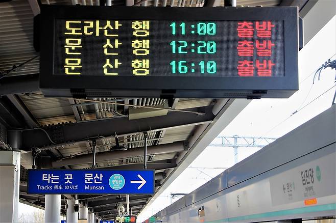 | ▲ 임진강역 전광판에 '도라산행' 열차 표시가 생생하다. |