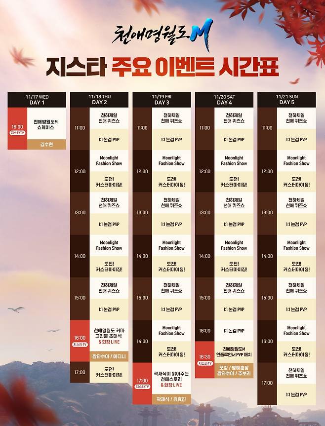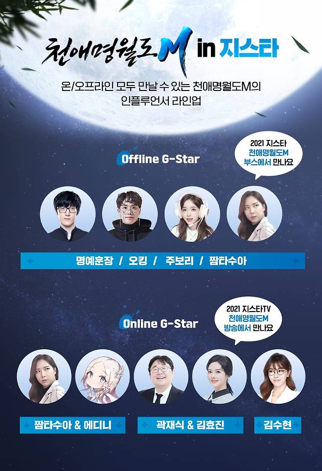또한, 특정 시간대 별로 유명 인플루언서와 '천애명월도M' PvP 매치를 실시, 짬타수아, 명예훈장, 오킹, 주보리 등이 무대 행사에 참여해 관람객들과 함께 게임을 시연할 예정이다.