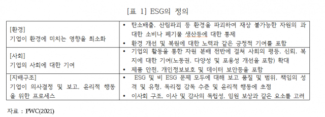 ESG는 기업의 지배구조의 수준(품질)뿐만 아니라, 기업이 직면하고 있는 환경적인 문제와 사회에 미치는 영향을 고려하여 판단할 수 있는 프레임워크를 제공하는 것이다. 국내외에서 정부뿐만 아니라 펀드사, 학술단체 등 그 종류와 숫자를 가름할 수 없을 정도로 다양한 정의와 평가 지표들이 쏟아져 나오고 있다.
