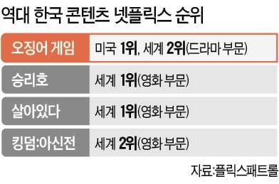 2~3시간 분량의 영화가 아니라 이야기 흐름이 긴 드라마로 세계 시장을 석권한 것도 눈여겨볼 점이다. ‘승리호’와 ‘살아있다’가 전 세계 넷플릭스 영화 부문 1위, ‘킹덤:아신전’이 2위를 차지했지만 드라마로는 정상에 오르지 못했다.