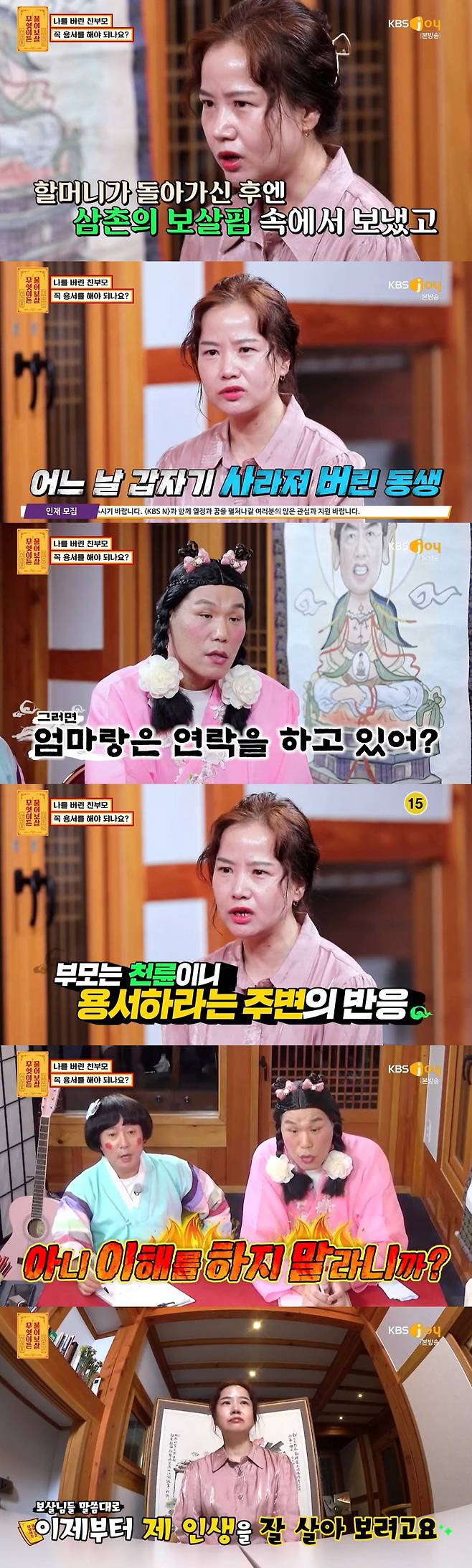 또 다른 의뢰인은 "나를 버린 친부모, 용서를 해야 할까요"라는 고민을 들고 나왔다. 이어 자신을 키워준 분들은 친할머니와 삼촌이며 고등학교 때는 친구 집도 다니고 쪽방에서 잠을 잔 적도 있다고 설명했다. 부모님에게 버려진 탓이었다. 의뢰인은 "부모님은 저를 거의 안키워주셨다. 친동생도 있었는데 어느 순간 없어졌다. 시간이 지나 삼촌께 여쭤보니 덴마크로 입양이 됐다고 하더라. 아무도 제게 이런 사정들을 잘 알려주지 않았다"라고 털어놨다.