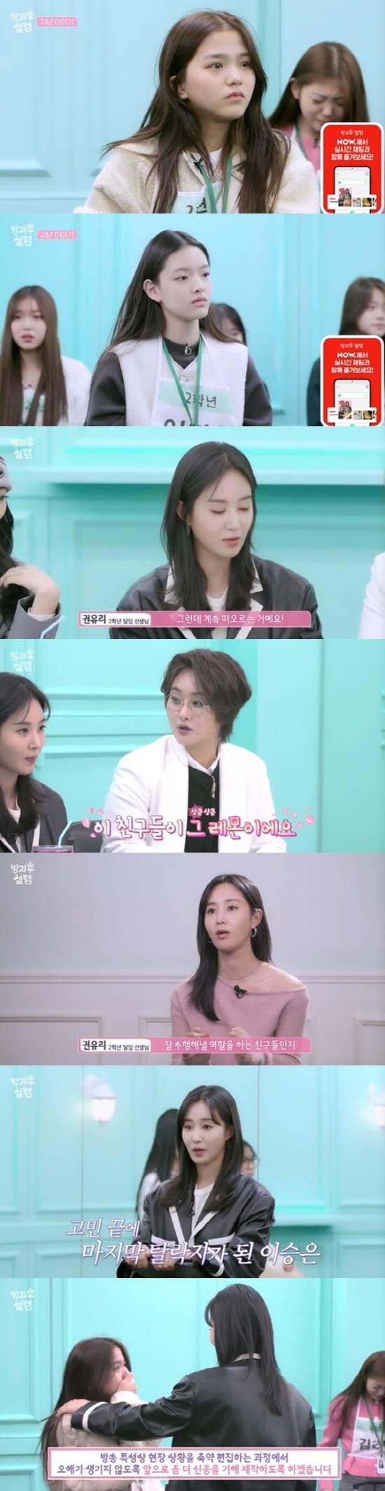앞서 12일 방송분에서 심사위원이자 2학년 담임 소녀시대 유리는 탈락자 후보 이지원과 이승은 중 이승은을 탈락자로 호명했다.